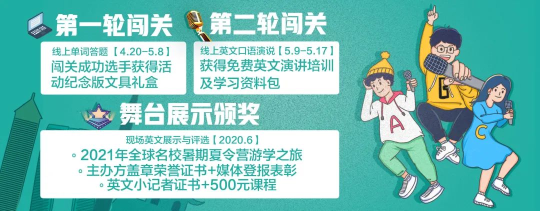 第三轮闯关(暂定6月):现场英文展示与评选——获胜者将有机会获得万元奖金&全球名校暑假游学名额