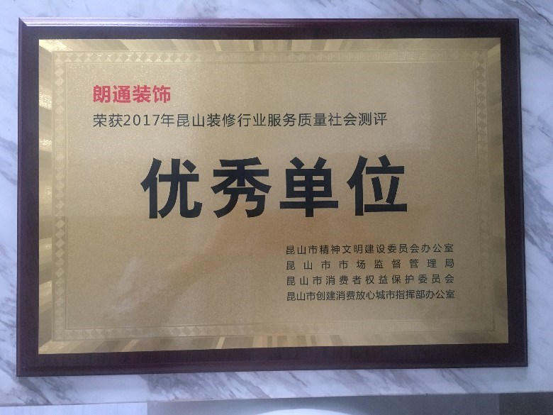 恭喜朗通装饰获得“优秀单位” 历时半年多近一年的时间经过广大网友及社会各界人士的参与投票,装饰行业社会测评结果出炉,能够获得如此殊荣,衷心感谢昆山精神文明办、昆山市场监督管理局、消保委、昆山消费放心城市指挥办公室、昆装协等各级领导及支持单位,举办2018表彰大会!会议表彰了“昆山管理优秀单位”,我司获得昆山装饰企业单位“优秀单位”荣誉。广大业主们都知道朗通装饰一直以来做的是品质,拼的是服务,一直坚持做环保家装,希望用我们的实际行动来帮助更多的人住环保的家为使命,来推动整个家装行业的进步!朗通装饰能在昆山小小几千家装饰公司名列前茅获得“优秀单位”感谢广大业主朋友们及政府职能部门对我们朗通装饰公司的认可!为了回馈广大业主及朋友们,朗通装饰今后的道路上唯有不断提升服务质量,提高施工品质才能不付众望!树立行业典范,弘扬工匠神!