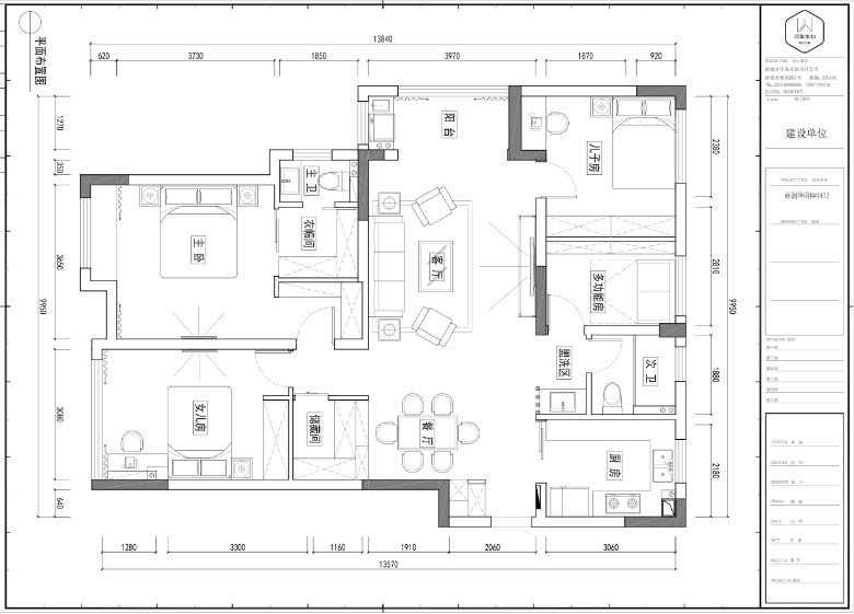 设计师整体优化室内流动线,迎合主人公的需求,三室改四室,使布局更合理;考虑到女主人的生活需求,从而打造出一个衣帽间;考虑到家里有两个小朋友,设计师设计了两间独立的儿童房,同时这两个房间书桌的设计,都考虑到了每个孩子的喜好;选材和用色上巧用心思,使整个家里光线充盈,温馨如画。