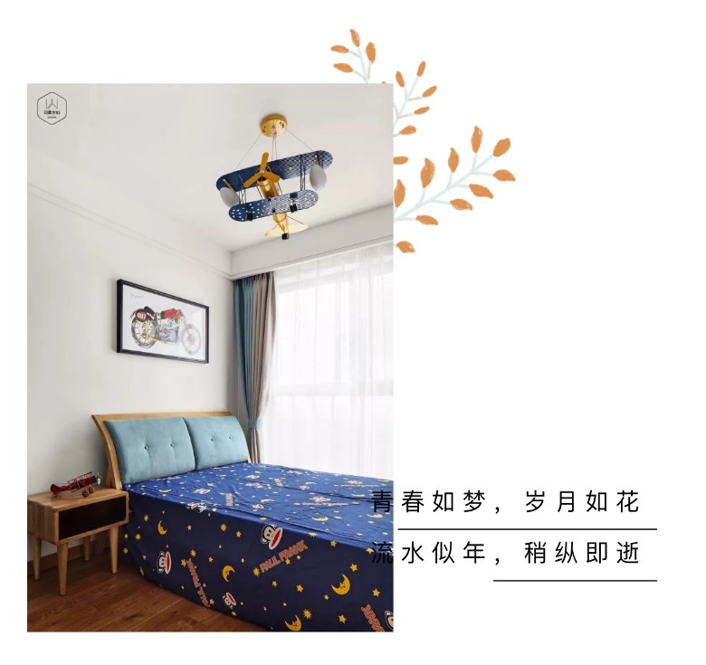 男孩房的设计主要体现在软装上,卡通飞机模型的吊灯设计,就带着别具一格的时尚感; 书桌的设计,只为给孩子一个好的学空间;选用饱和度较低的蓝色为主色调,辅以白色、木色搭配,给孩子全方位的守护;床饰中的星河闪耀着孩子的梦。
