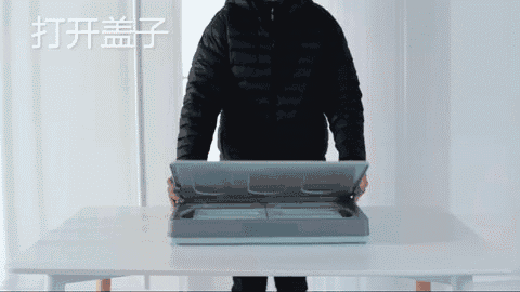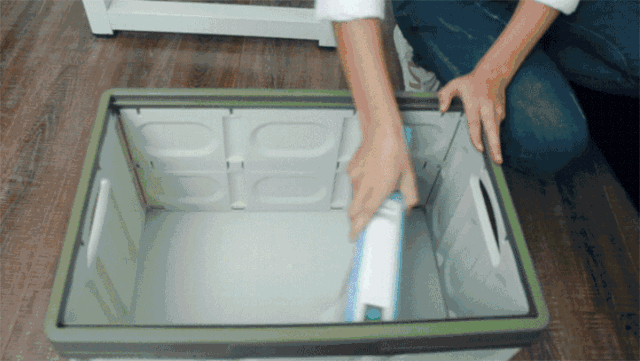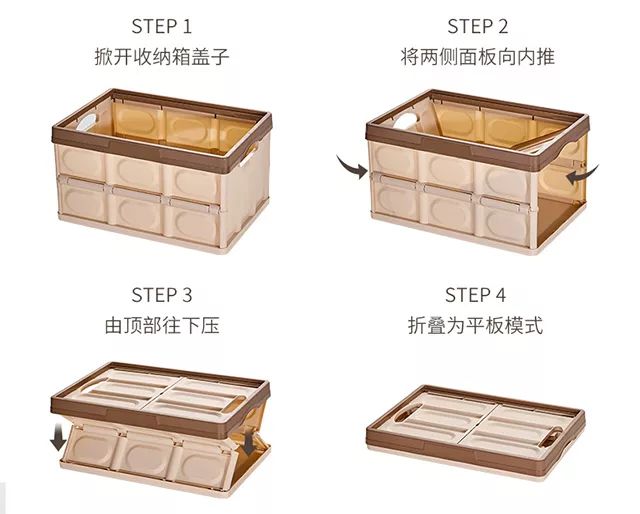 掀开收纳箱盖子,将两侧面板向内推,再由顶部往下压,折叠为平板模式即可;