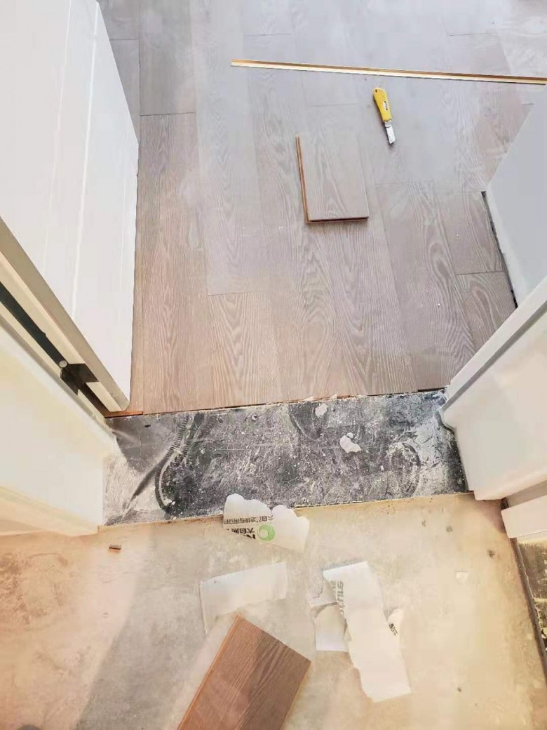 其实地板比过门石高1mm的样子,还好师傅手艺好,两边涂上玻璃胶,安装可以的。