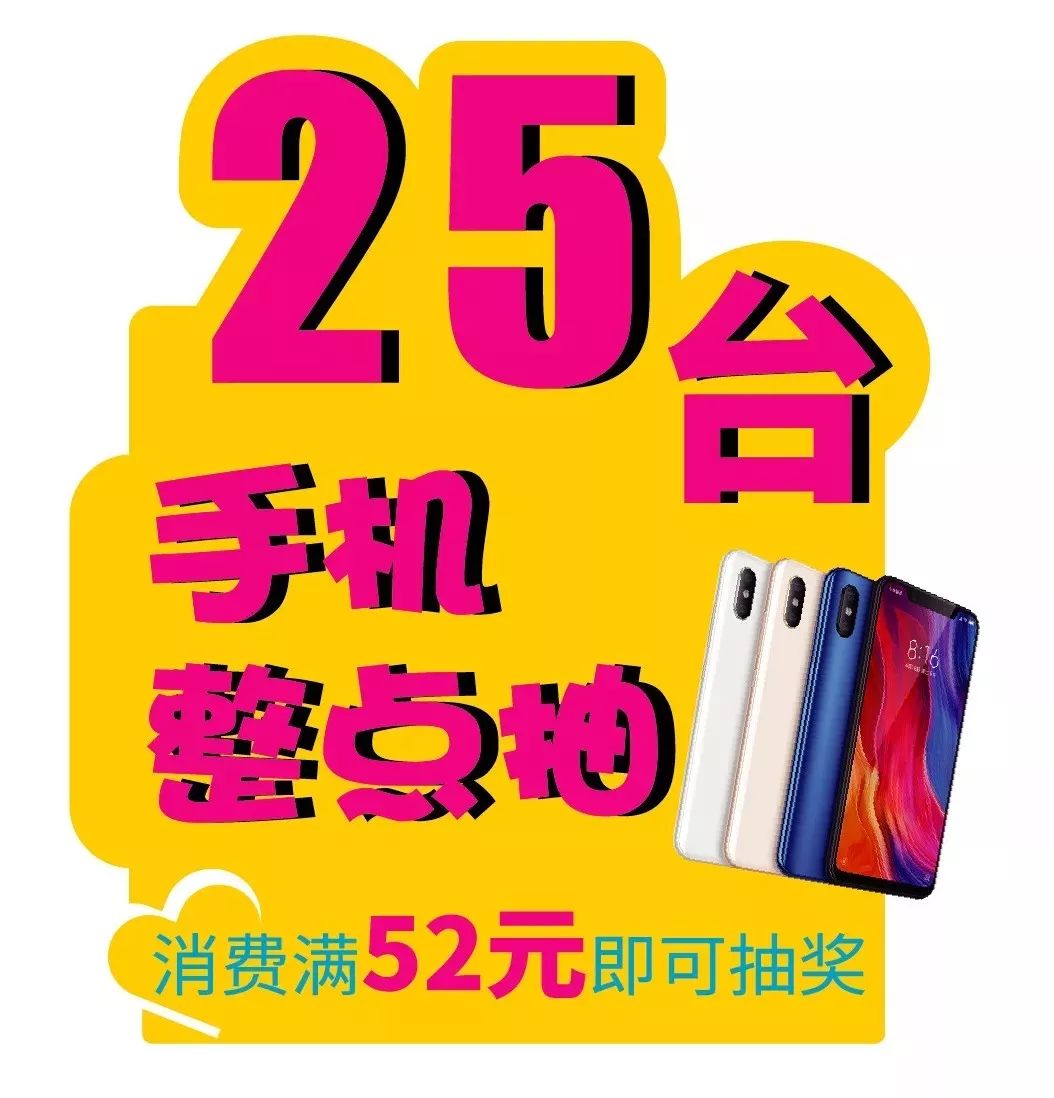 活动内容:凭当日消费满52元小票前往指定地点即可兑换奖券一张,5月19日将进行5轮整点抽奖,每轮将诞生5名幸运顾客,获得手机一部,数量有限,先到先得。