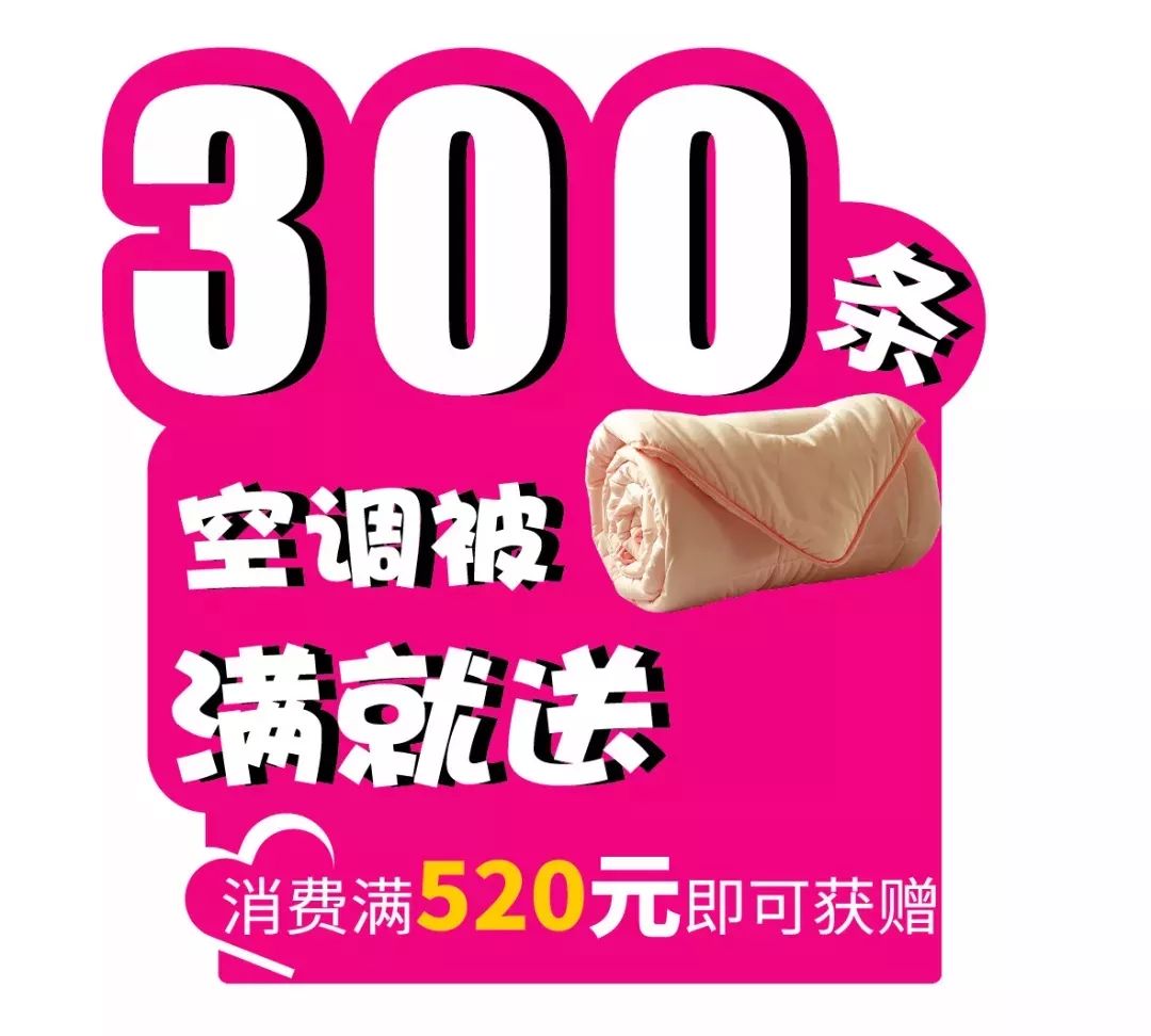 活动内容:活动当日全场消费2张满520元,即可兑换小怪兽空调被1条,数量有限,先到先得。