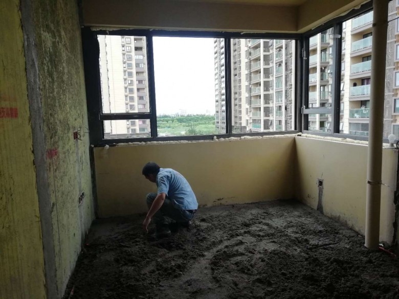 瓦工一大早发来微信,说今天施工,我立即前往。今天给房间找平,工作有条不紊。我协助瓦工老婆把安窗义玻璃搬到客厅。台风过境,阳台钥匙无法安装。玻璃挺沉,搬起来很吃力。