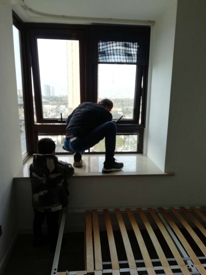 一大早,安窗义门窗蔡师傅上门补两扇窗户。他带了他四岁的儿子来了,这对父子兵,父慈子孝,很有趣。