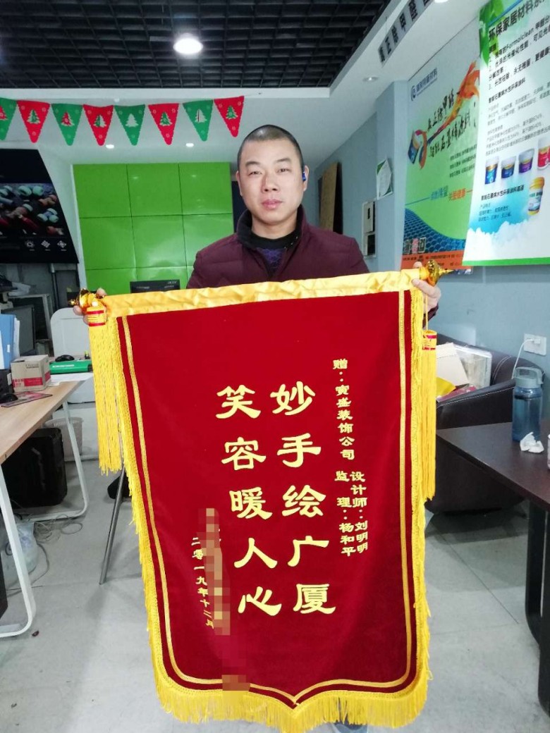 紧接着去了寅盛,结尾款,送锦旗,感谢这段时间寅盛设计师小刘,监理杨和平,以及所有施工人员的辛苦付出,感谢。