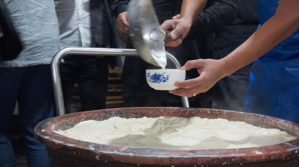 工艺有讲究,必须大铁锅熬制,柴火灶竹片烧制,曾师傅笑称“心急吃不了热豆腐”,铁锅慢熬,夏天需要25分钟,冬天30分钟,这样才能最大程度地发挥豆腐的口感。现场品尝一碗刚刚出炉的豆浆,豆香扑鼻,好不满足!