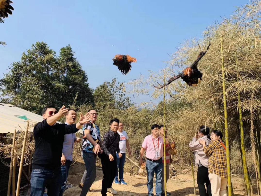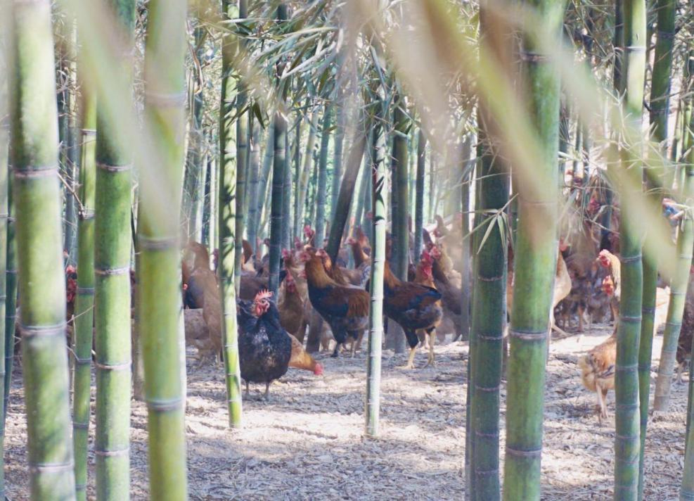 满山林跑的竹林鸡,也练就了十八般武艺,一行人刚刚走近,鸡群就扑棱着翅膀,飞出几米远,着实看呆了我们这一群人,养殖基地的师傅,自豪的说,“我们家的竹林鸡吃小虫,喝山泉水长大,个个都轻功了得,白天你很难抓得到它!”