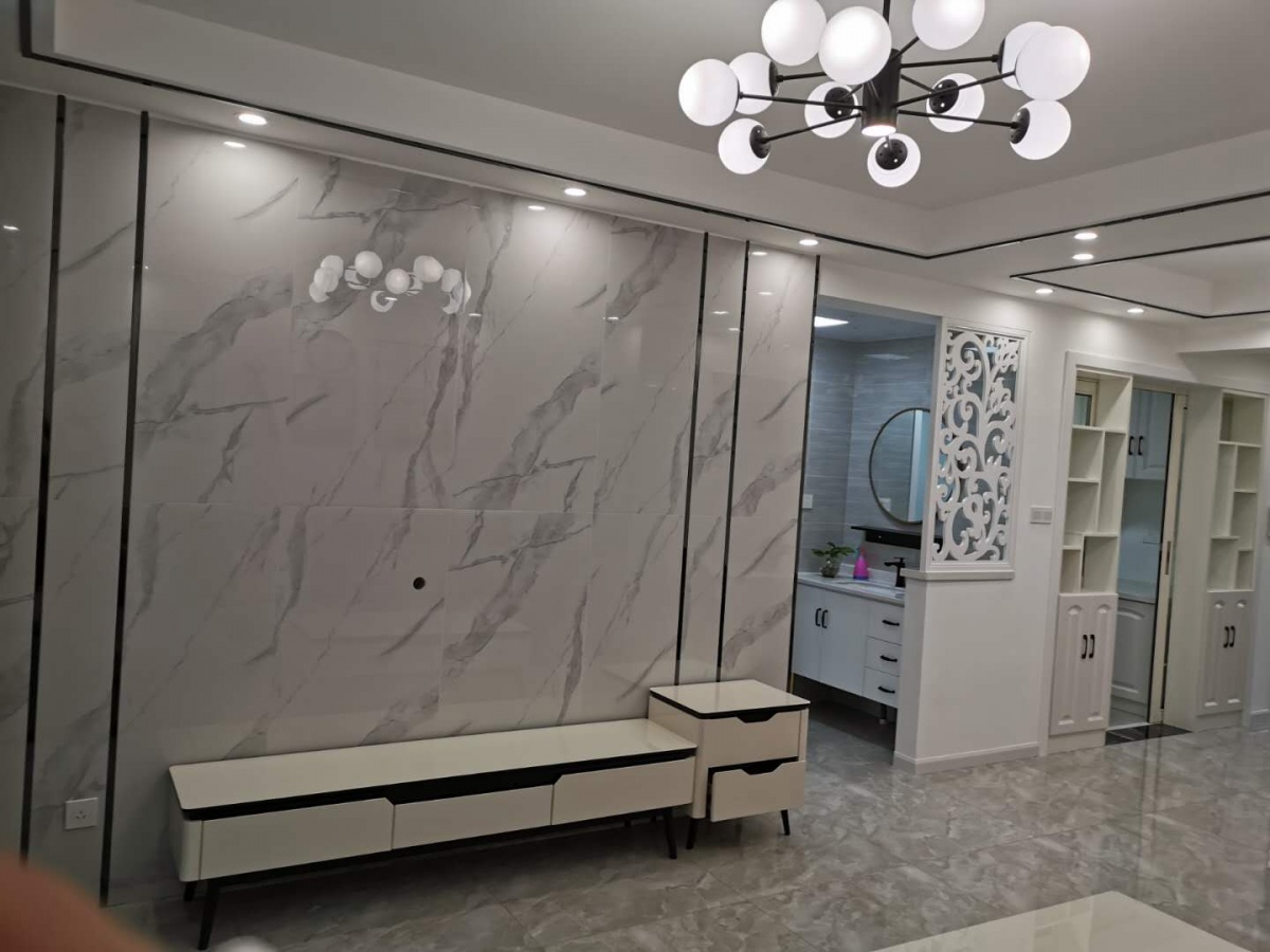 客厅整体空间颜色以浅色为主,搭配灰色沙发,彩色抱枕点缀,现代风格瞬间呈现出来了。电视背景墙以整面大理石做背景,配上黑色金属压条,简单大方。
