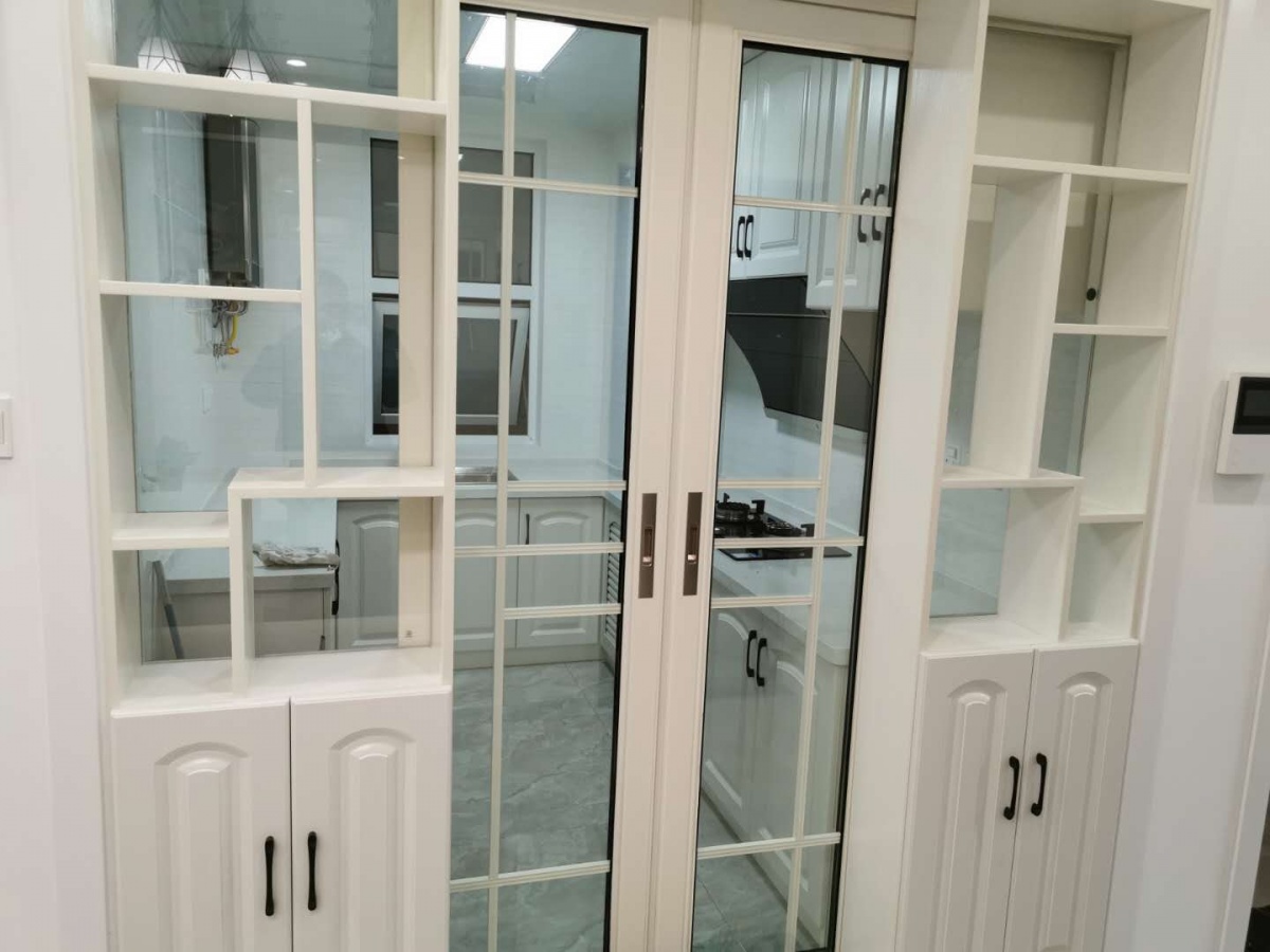 厨房的U形设计,也很方便以后的使用,特别是门口的玻璃橱柜设计,增加了厨房的采光,让整个空间更添通透感。