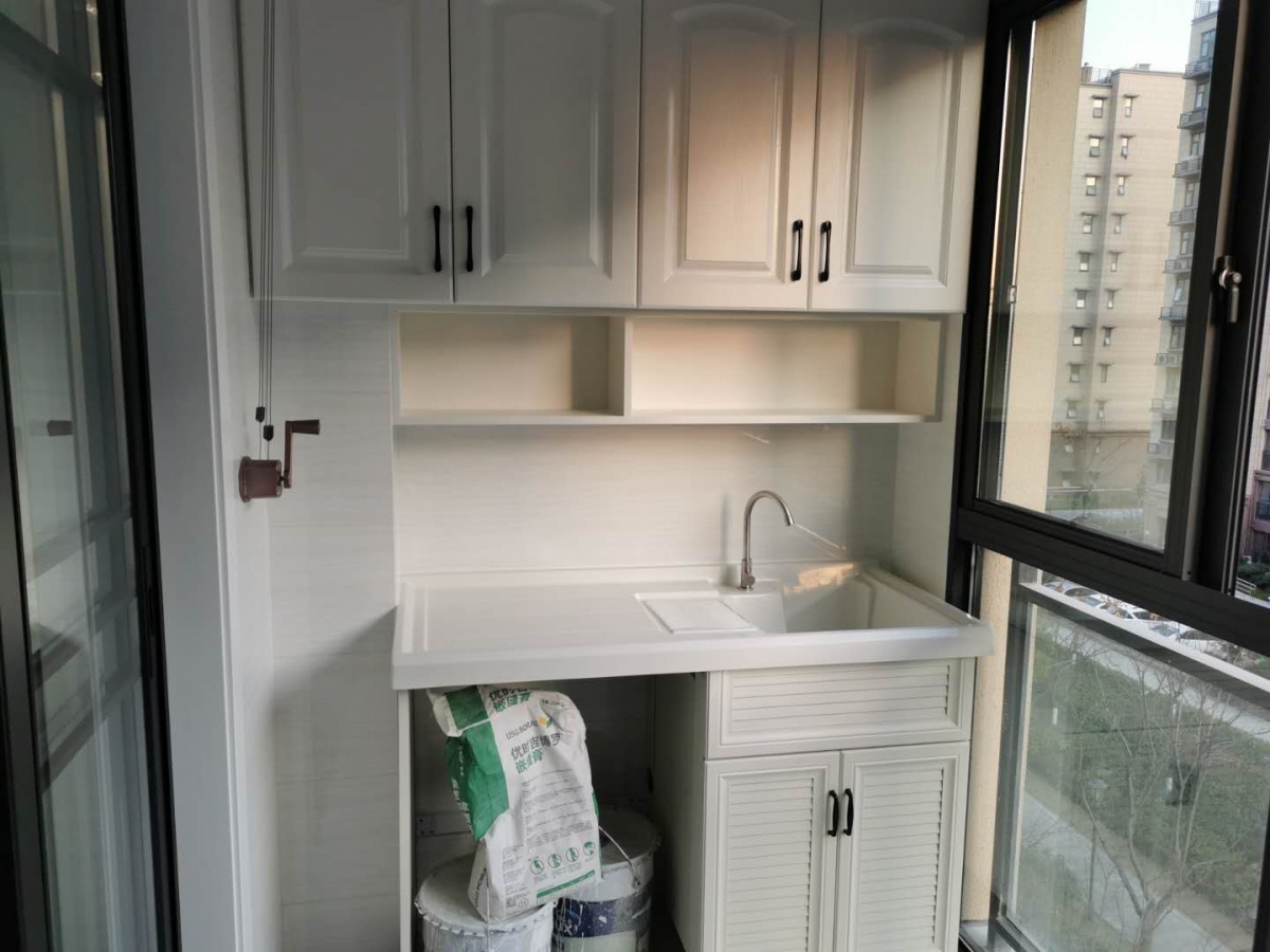 阳台是洗晒区,台面做了一体柜,方便以后的洗刷。上面部分做了吊柜,提高了阳台的储物能力。