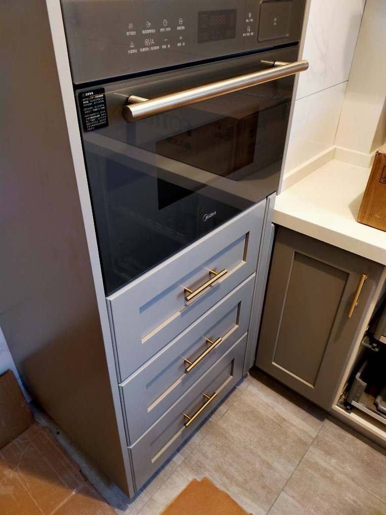 我也不例外,厨房是我设计最满意的地方,后期的配置也是最高,喜欢美食,橱柜肯定不能没有个性,由于老板量错了门板,拉篮门板还得后装,等后期家具软装配齐,再讲一些居家生活以及装修细节,今天在家待了一天,看师傅安装,我买了两种纯铜拉手,被装错了一组,本来阳台柜上面为小圆拉手,只能将错就错了,这次放了阳台柜原因,是顶部防腐木(桑拿板)吊顶,建议阳台如果晒衣服,要么桑拿板要么铝扣板,因为长期水蒸气,顶部涂料多数会有牛皮癣(开裂掉皮)现象