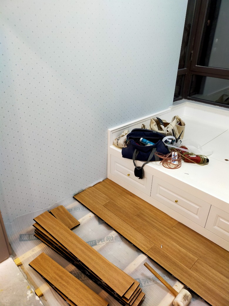 晚上回家去了一趟,今天开始铺地板了,选的徐家地板,徐家实木地板算是国内做的最好的,工艺在于地板反面有防潮膜,可以直接铺地下室,这次和大家分享的,我家为什么最后才铺地板,是考虑到地板保护问题,多一个工种多一个师傅干活就存在破损的风险,上次水电安装还给我柜门碰坏了一个点,如果定制家具就没办法了,因为地板不铺没法安装,定制家具和木工打家具比有几个优点,层板封边,地板和柜子收口处不需要压条,一般木工打家具都需要有压条,我家完全是按着定制效果去操作,解决定制和木工打的各自缺点,上面都有提到。