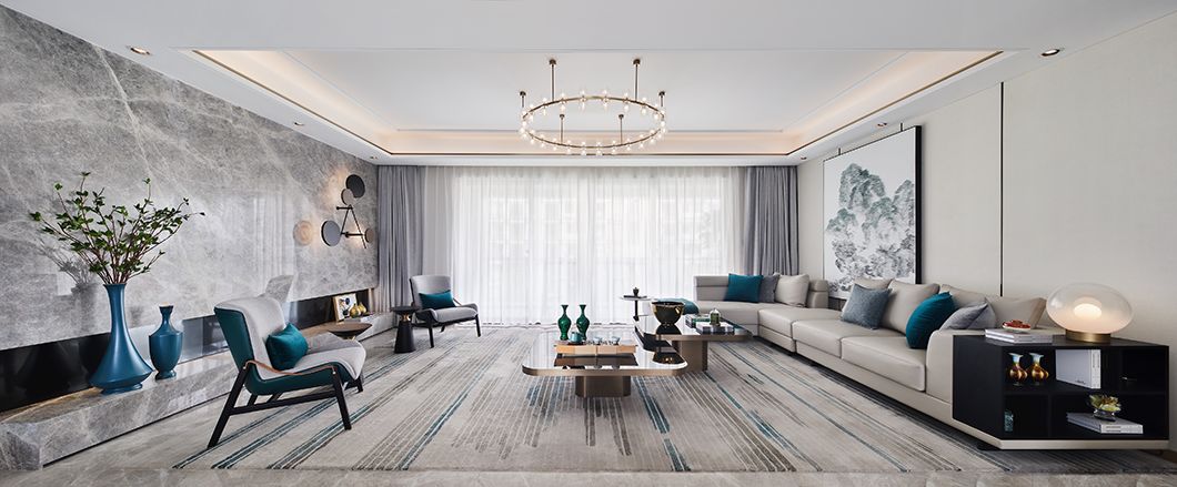 为此设计师在用色、选材上大花心思,以沉稳睿智的镜湖蓝、知性优雅的高级灰,璀璨温暖的橘棕色与深远宁静的丛林绿,形成这座大宅独特的气质色彩,渲染一种扣人心弦的华美。