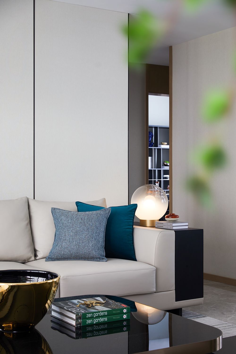 客厅使用纵轴设计,以L型沙发及组合茶几,搭配两侧单椅的围合手法,拉伸整个客厅的体量感,强化入户的第一感官,令其更显开阔。个性化定制的沙发,侧边引入功能性柜体,以细节成就家居体验。
