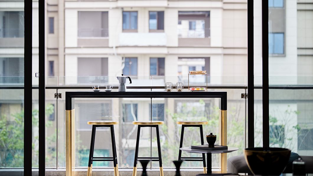 观景阳台是客厅向室外的延伸,以实木和金箔打造吧台区,精致与休闲感并存,于此尽揽户外风光,颇有“闹中取静”、“忙里偷闲”之态。