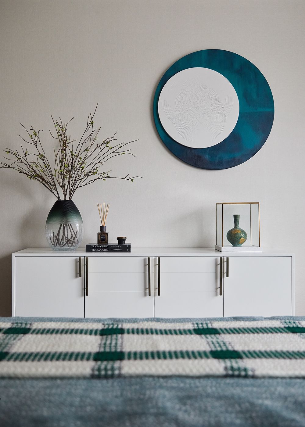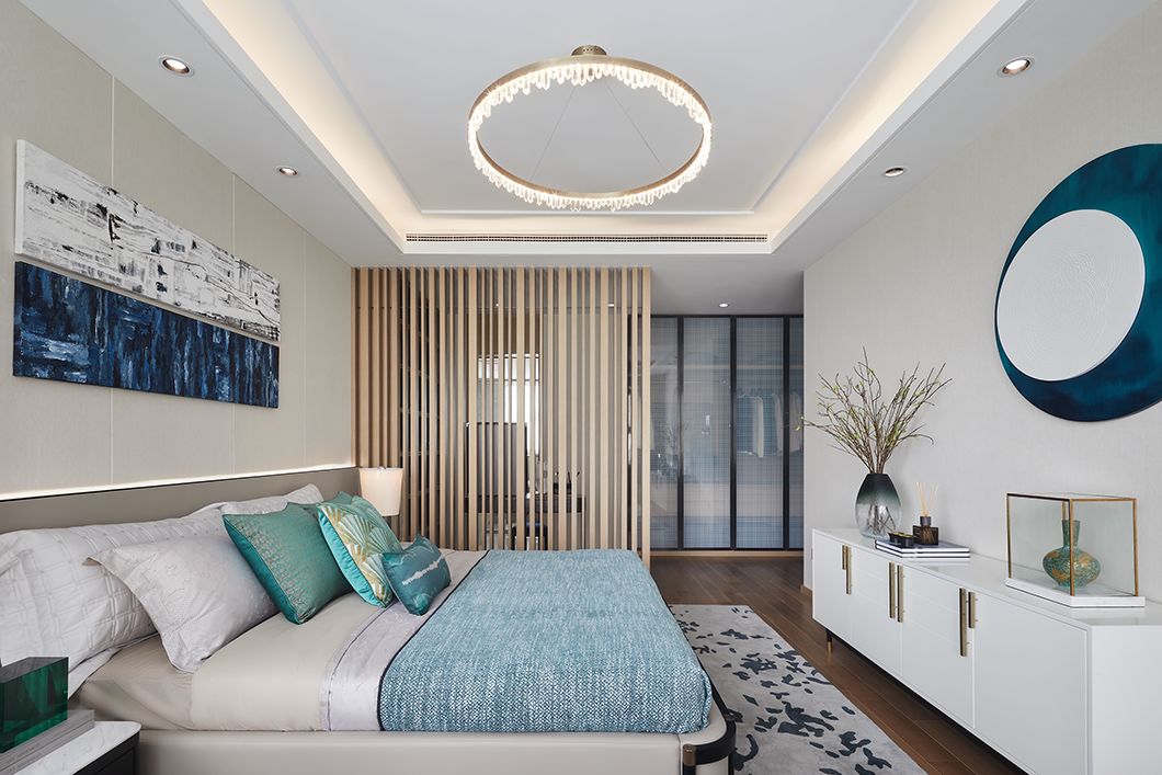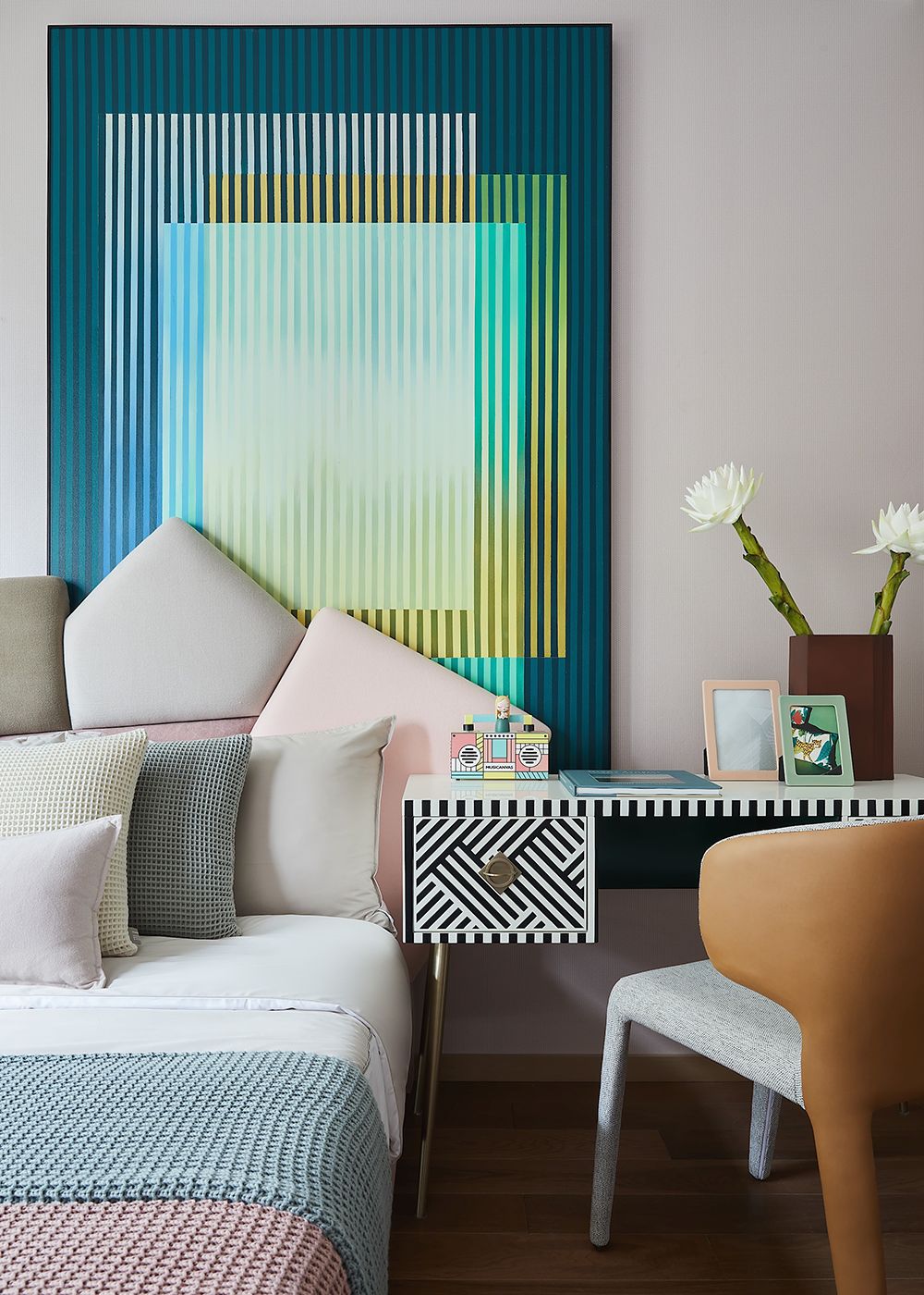床头灯具以高低错落的组合形式打破常规,提升层次。立体感极强的挂画,为主卧的视觉焦点,家具造型也更为凸显现代气息。