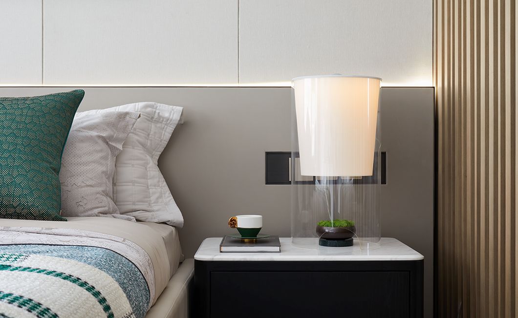 主卧床背与床一体化设计,空间关系更加完整,隐藏灯带的设置,运用光与影营造温馨与时尚氛围。