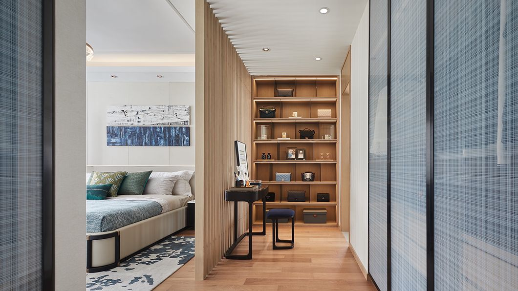透过木格栅,主卧亦可一窥衣帽间的风采。展示性与功能性兼并的衣帽间设立于走廊尽头,设计师在不经意的笔触中,将低调奢华的高贵感勾勒而出。