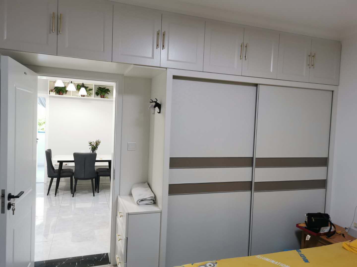 卧室有点小设计哦,橱柜没有做满,门口处留了一点地方,放一个斗柜,装几个挂钩,随手放放东西,挂挂衣服也是很不错的。