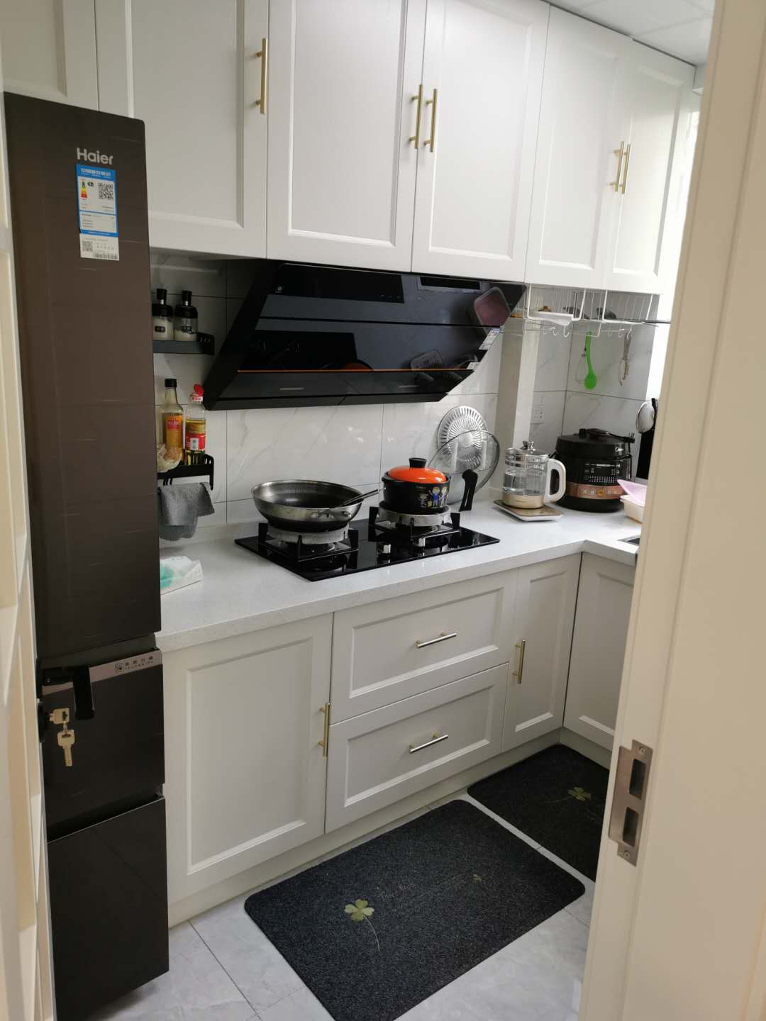 厨房以白色为主,显得干净整洁,L型布局也是方便平时操作,墙面还做了收纳,很清爽,冰箱放在了厨房,方便使用。