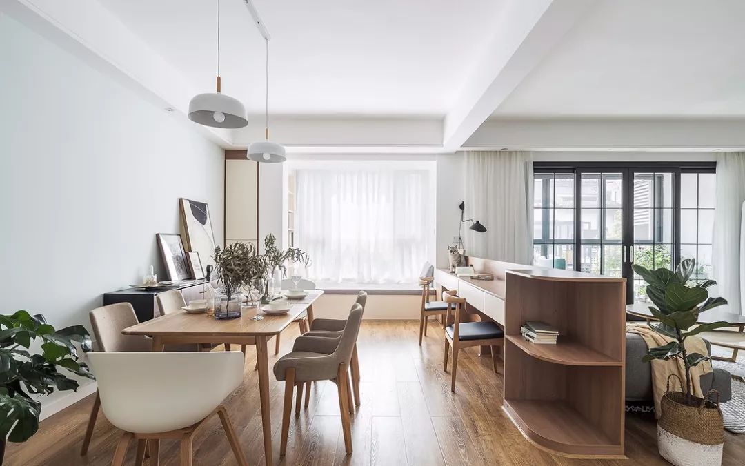 客餐厅是横厅,刚好把书桌的位置放在了沙发后面,正好也相当于了沙发背靠柜的功能,和餐厅之间有个遮挡。