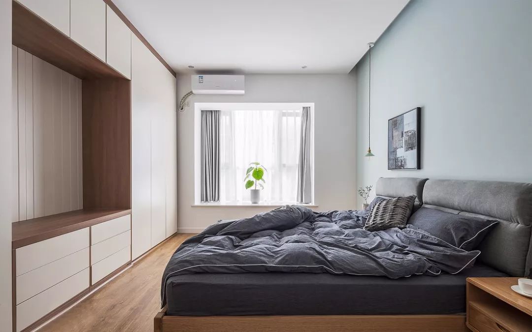 主卧安静素雅,床尾设置了一整面墙的衣柜,并预留出摆放电视的位置,整体轻松惬意。