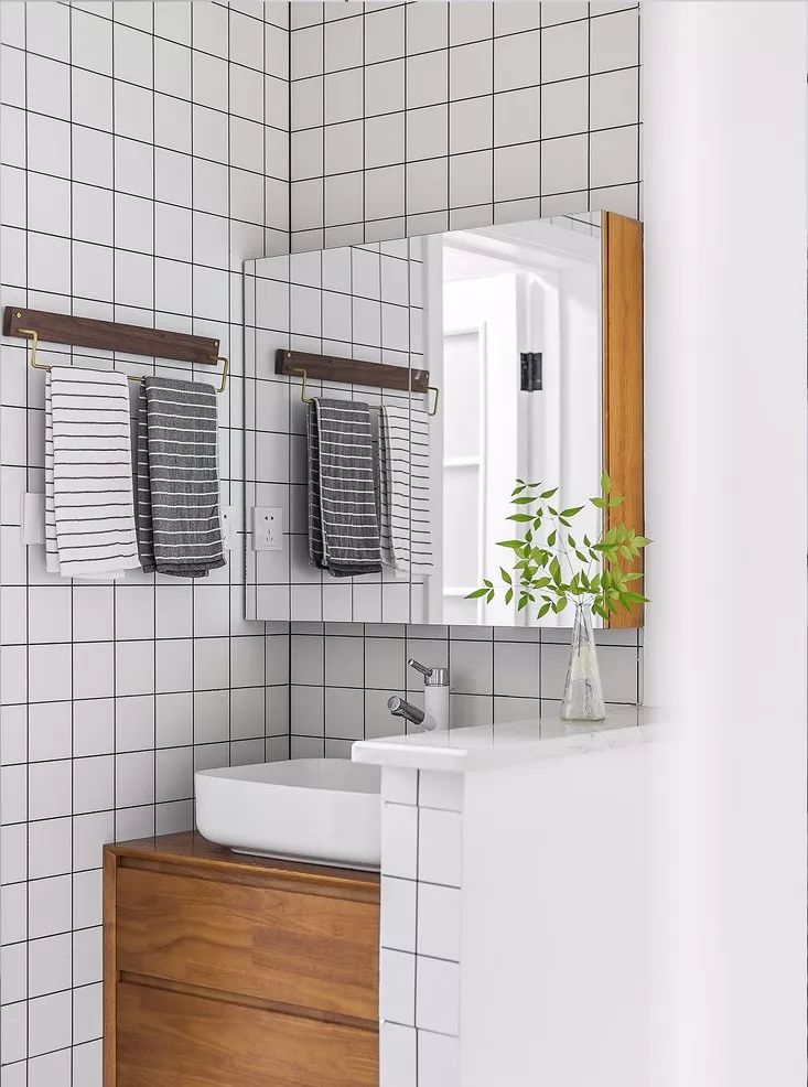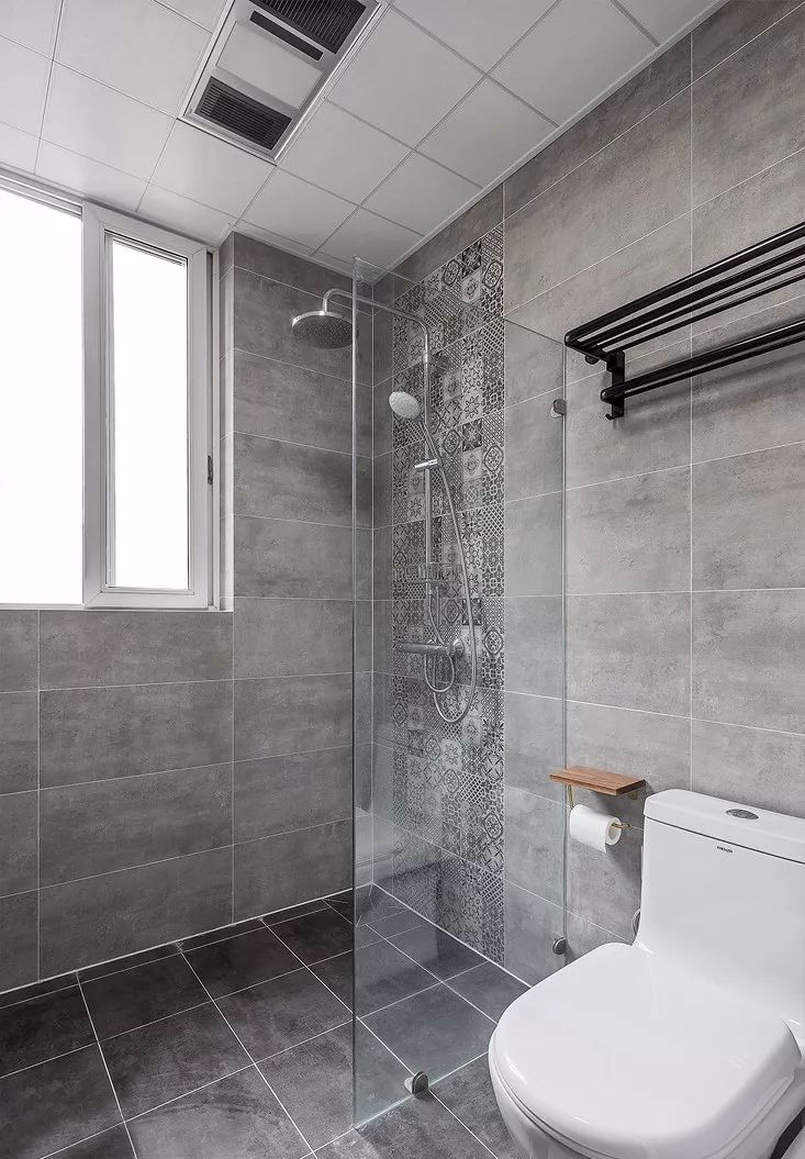 次卫干区位置做了镜柜,里面可以装很多的洗漱用品,半高的台面也可以随手放一些东西。 湿区灰白调搭配,用一块玻璃做隔断,时尚美观又实用。