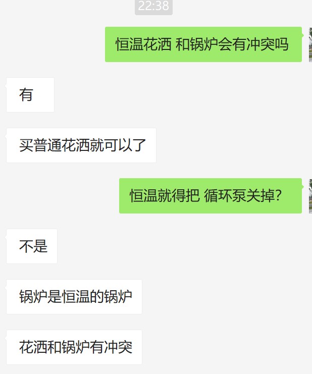 恒温花洒和锅炉冲突,水温忽冷忽热,机器还频繁启动实际的情况是,恒温花洒是在自动调控冷水和热水的比例的,当冷水突然变小的时候,热水也会变小,而突然变小的热水量会让锅炉锅炉的功率急剧降低,低于锅炉的最小功率比值,那锅炉就无法控温,功率既然无法降低,那就水温升高,水温就会一下子变的非常高,锅炉就会高温保护,就停掉了。所以说会造成频繁启动,对于锅炉来说不是特别好。