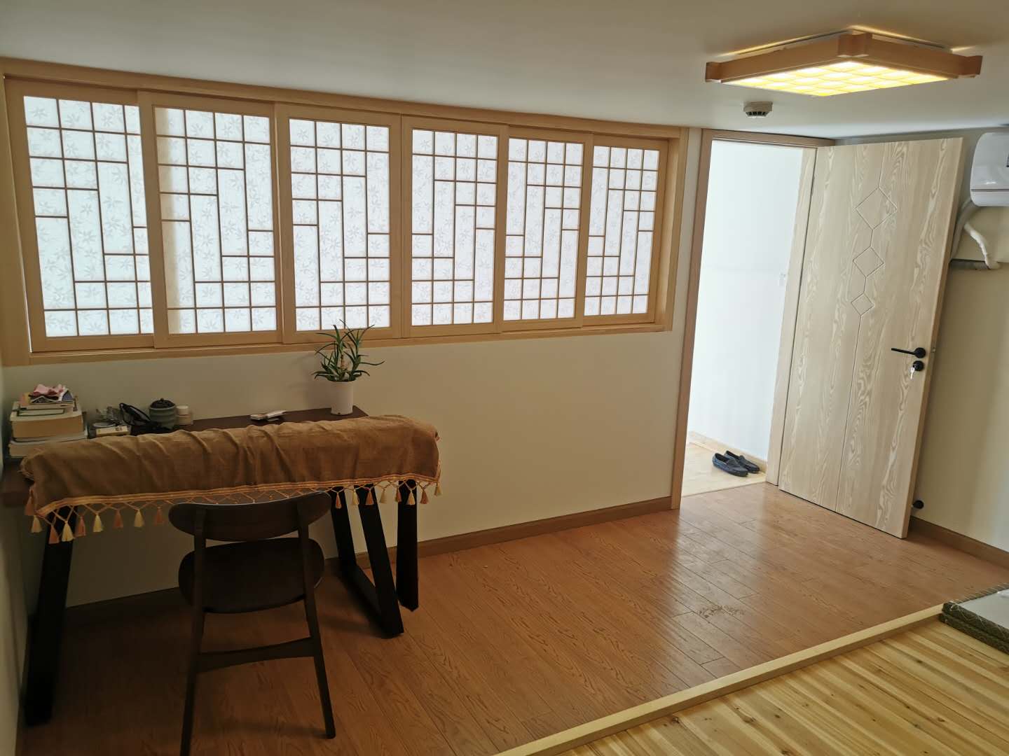 楼上是房间,也是沿袭了日式榻榻米风格,榻榻米上放置的蒲团,一下就把我们带到了东京。墙上也做了入墙式收纳,配以山水画㕑门,很有禅意。