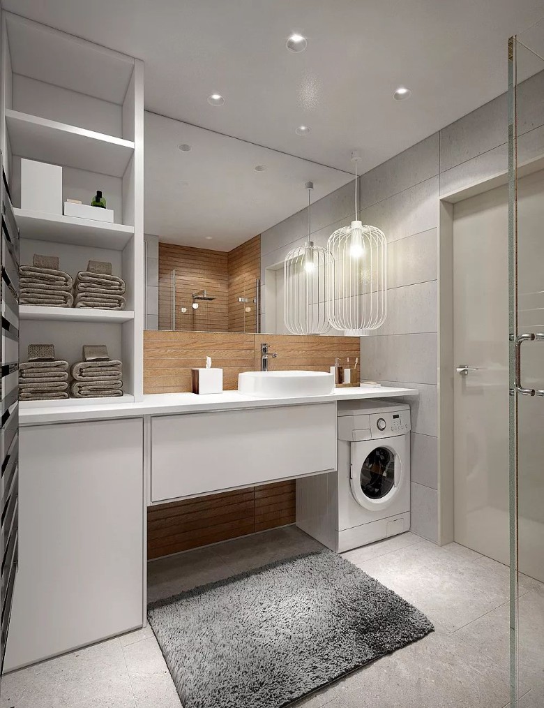 洗漱台下放置洗衣机,有一个很大的优点就是方便给水、排水,按照洗衣机的尺寸定制一个洗漱台,在加上收纳用的浴柜,让卫生间看起来既整洁又干净。