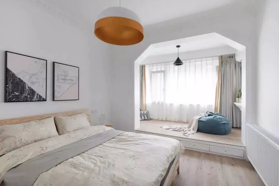 打通之后的卧室阳台,视觉效果更加明朗,让卧室空间多了一丝积极美好的生活感。为了区分,可以适当抬高阳台地面,营造出错落的美感,平淡的空间变得丰富有趣起来。