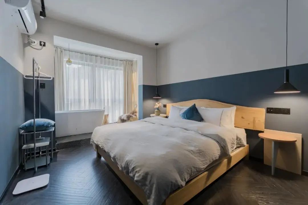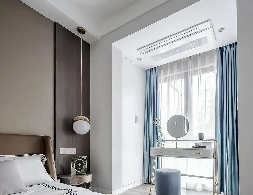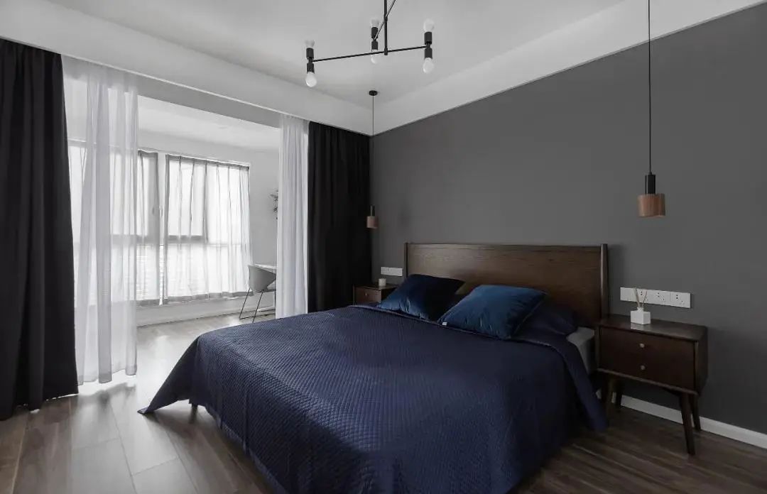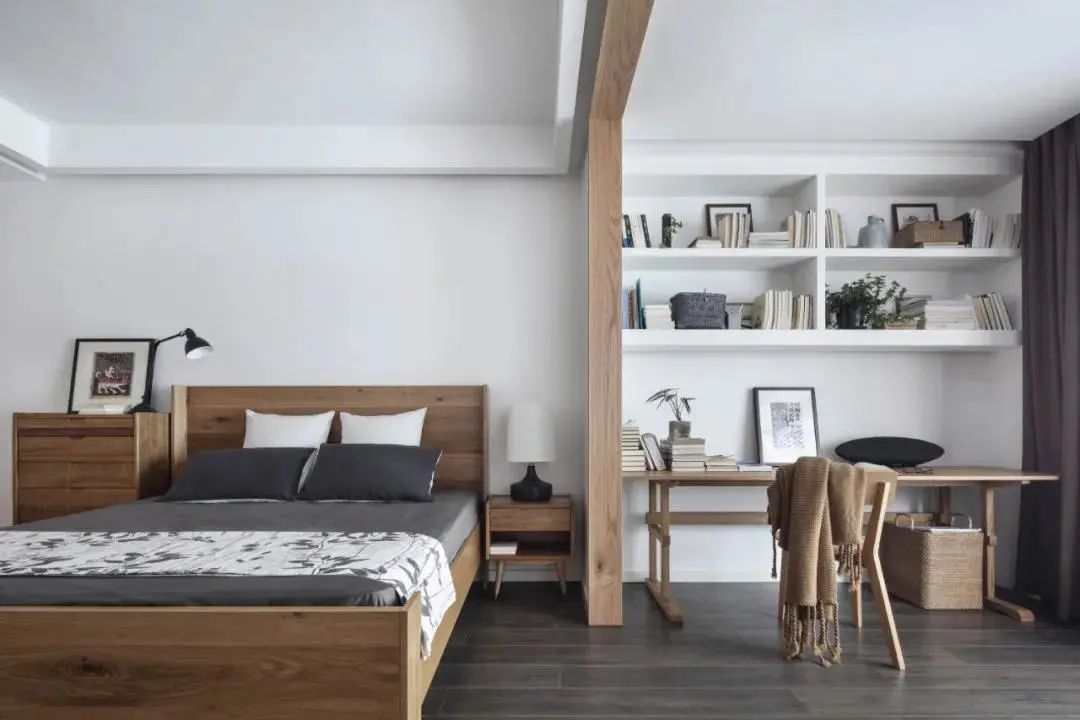 一体化的设计,可以将窗帘安装在区域中间,拉开即可变身为一个完整的区域;合上帘子,相互独立,更有利于睡眠氛围的营造。
