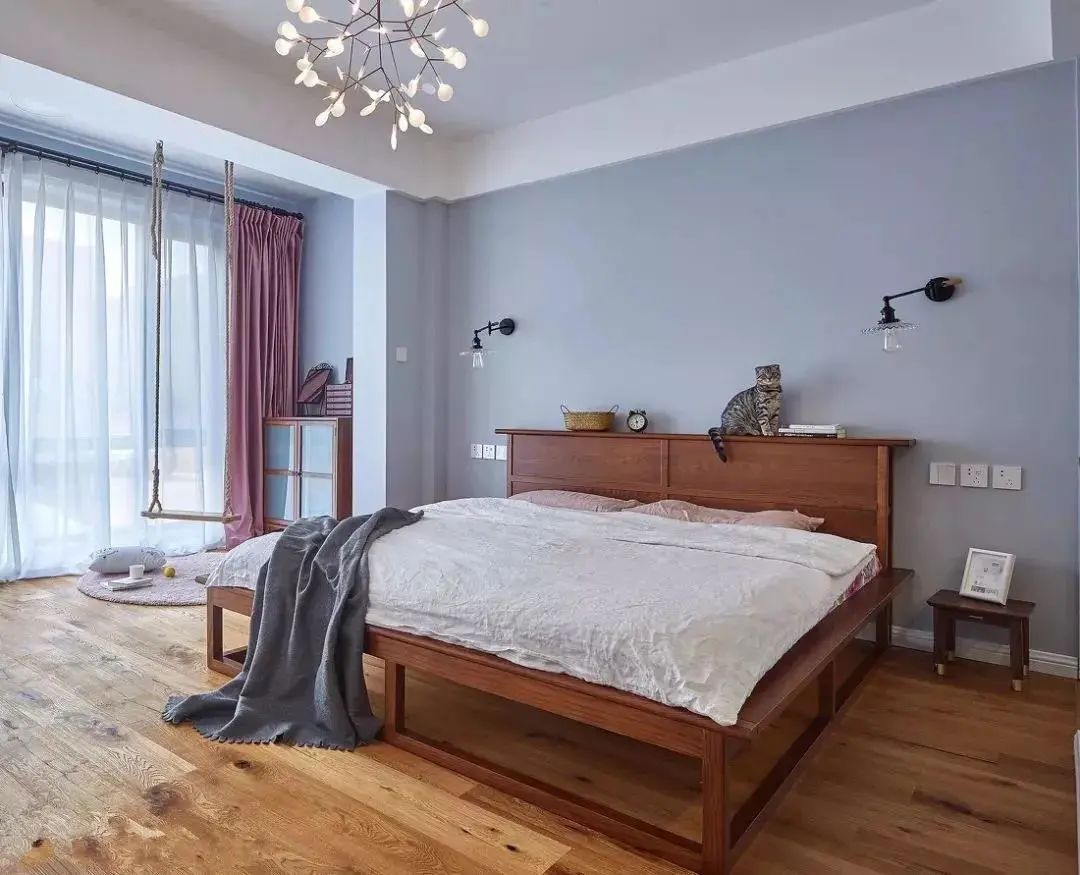 没有独立儿童房的家庭,将卧室阳台改造成儿童房,用推拉门+窗帘和主卧隔断,可以有效保护父母和孩子的隐私。