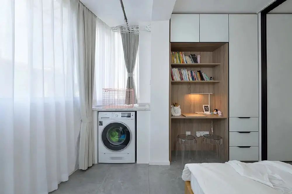 比较独特的户型,客厅没阳台或客厅阳台作为休闲区,那么卧室里的阳台可以设计成洗晒晾衣的空间。