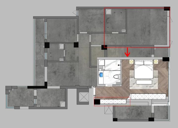 想要增加主卧收纳、儿童房学区,直接卧室里面加会显得拥挤,于是两个卧室之间相互交错一部分空间,实现两个空间的功能自由。