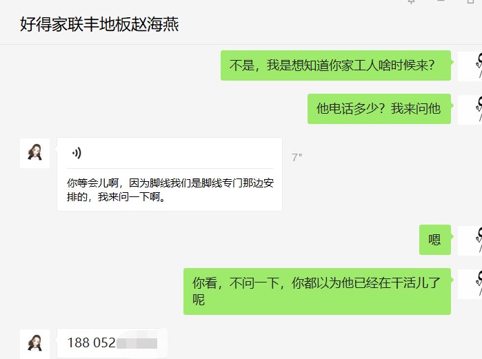 被联丰地板这个工作人员气死了。说好今天上午一大早踢脚线的工人来补踢脚线,结果早上问的时候一开始x说是工人已经去了,我再问的时候又说工人还没去,我说让给我个工人电话,结果还给了错了。拨打完电话,我被接电话的人说脑子有病。这个人的后5位是63753。