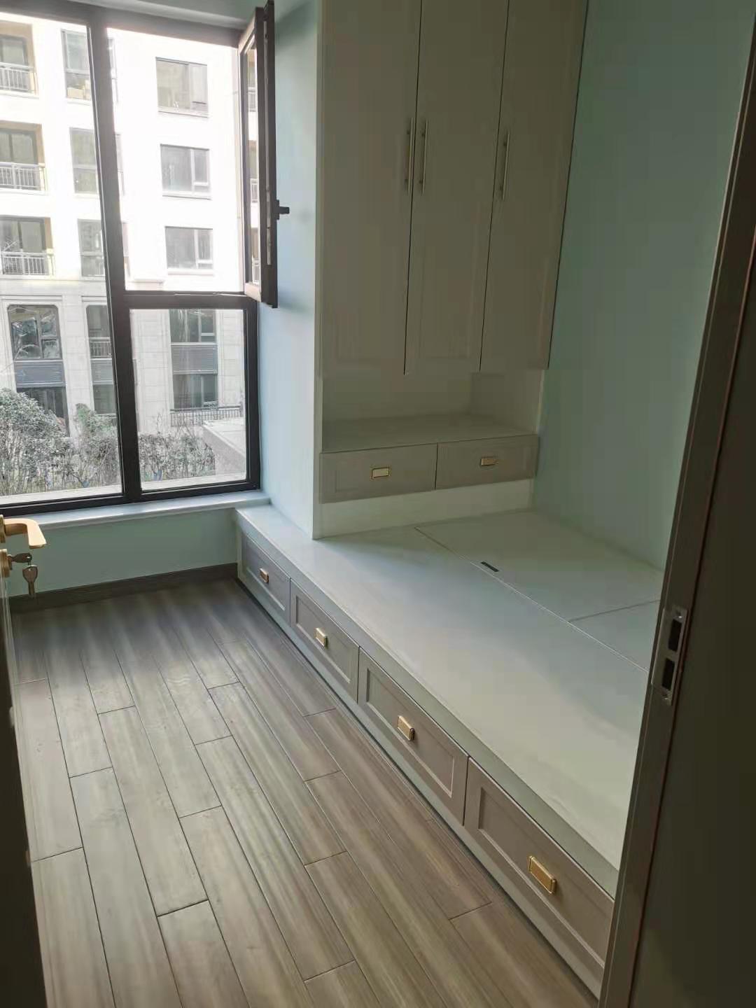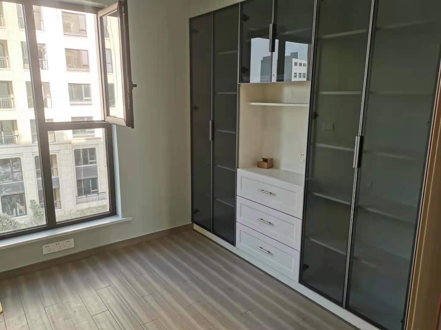 ▲这个房间的窗户很大,视野好,光线充足。房间的柜子用的是透明的设计,看着非常高级时尚。中间留空放电视机,收纳的清清爽爽。