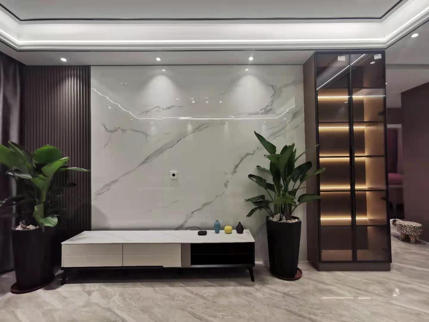 电视背景墙用的是大理石+木饰装饰面+收纳柜的组合方式,大气又好看。透明橱窗的柜子还带有藏光设计,非常高级。电视柜旁边两盆植物也是郁郁葱葱,生机勃勃。