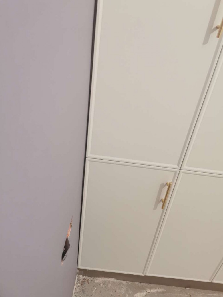 也不知道是墙面没找平还是木工打柜子没打好,次卧安装好柜门板之后墙到门板上宽下窄,最下面那格开合柜门直接卡掉墙面的漆了。现场看了,柜门是做的垂直的,没有做歪