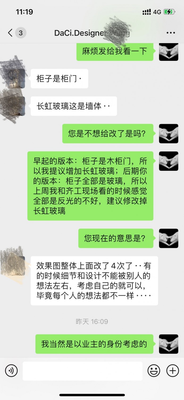 卧室衣柜,之前的设计是木柜门,我建议旁边的隔断做成长虹玻璃的,有点设计感在里面!但是设计师最后一版的设计图里,衣柜门全部做成茶色玻璃的了!上周末我和项目经理在看房子的时候聊到这一块,感觉床边全部是玻璃感觉不太好,夜里起来突然看到影子也怪吓人的!所以我昨天找到设计师,看看能不能把长虹玻璃取消或者衣柜门换成木柜门?然后设计师就火了,不同意修改,说我效果图都修改过三四次了!可是现在装修水电还没进场,我提出某个小位置需要修改一下,不可以吗?我很苦恼这个公司设计师的态度!最后这位设计师让我自己去小红书上找,自己看做成什么样子的!真的好心烦!