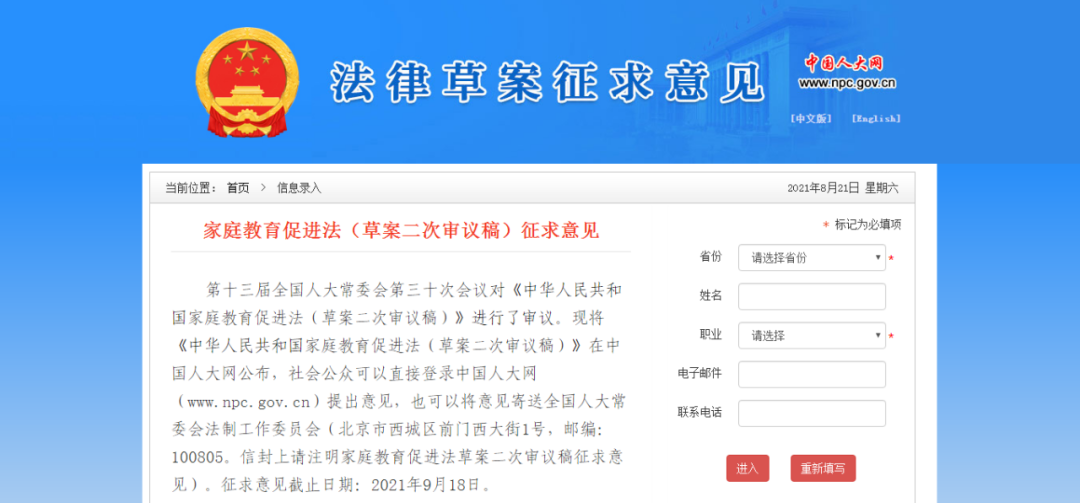 2021年8月20日,第十三届全国人大常委会第三十次会议对《中华人民共和国家庭教育促进法(草案二次审议稿)》(以下简称《家庭教育促进法》)进行了审议,并在中国人大网公布。