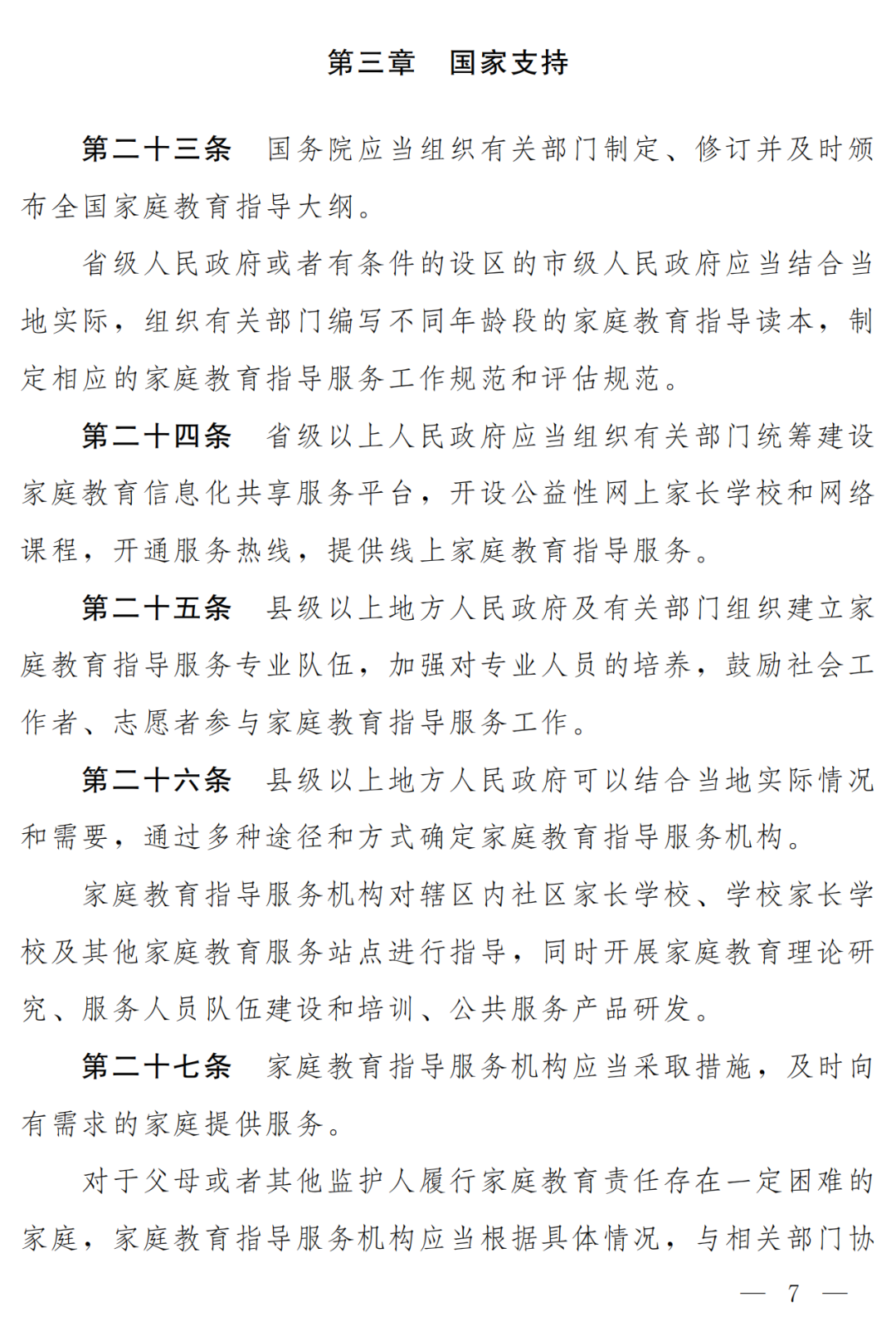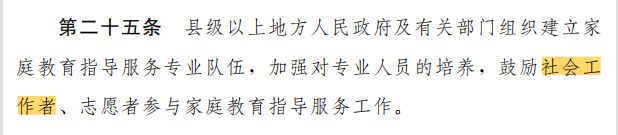 此次征求意见的《中华人民共和国家庭教育促进法(草案二次审议稿)》中,在“第三章 国家支持”部分的第二十五条,提出“鼓励社会工作者、志愿者参与家庭教育指导服务工作”。
