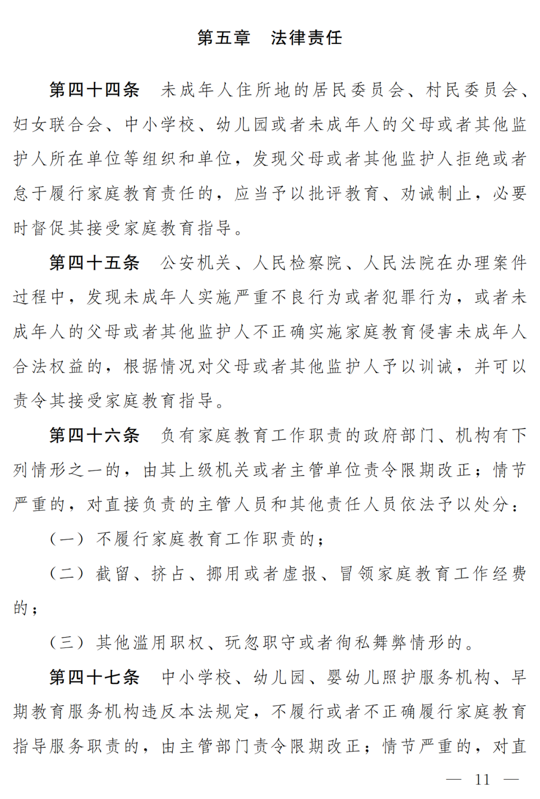 《中华人民共和国家庭教育促进法(草案)》提出,未成年人的父母或者其他监护人是实施家庭教育的责任主体。政府、学校、社会为家庭教育提供支持,促进家庭教育。必要时,国家对家庭教育进行干预。草案明确了公安机关、人民检察院、人民法院干预家庭教育的情形和主要措施,并对强制家庭教育指导的实施作出规定!
