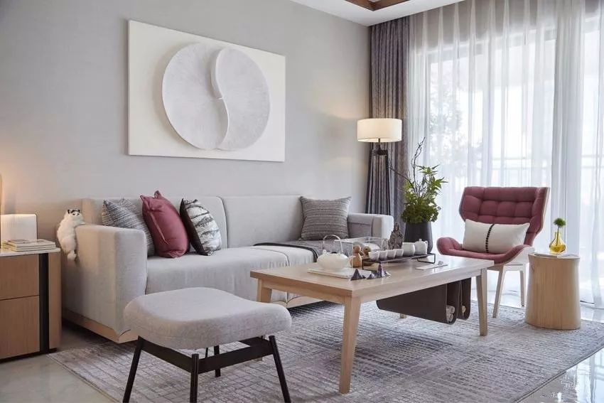 客厅以大面积以白色为基色,灰色布艺沙发的红灰交接的色阶带来丰富层次。