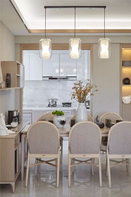功能简单的用餐区,即便面积小也做了餐边柜设计。餐桌椅靠餐边柜摆放,墙面的储物柜集收纳与展示功能于,不占地方又实用。