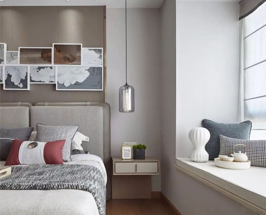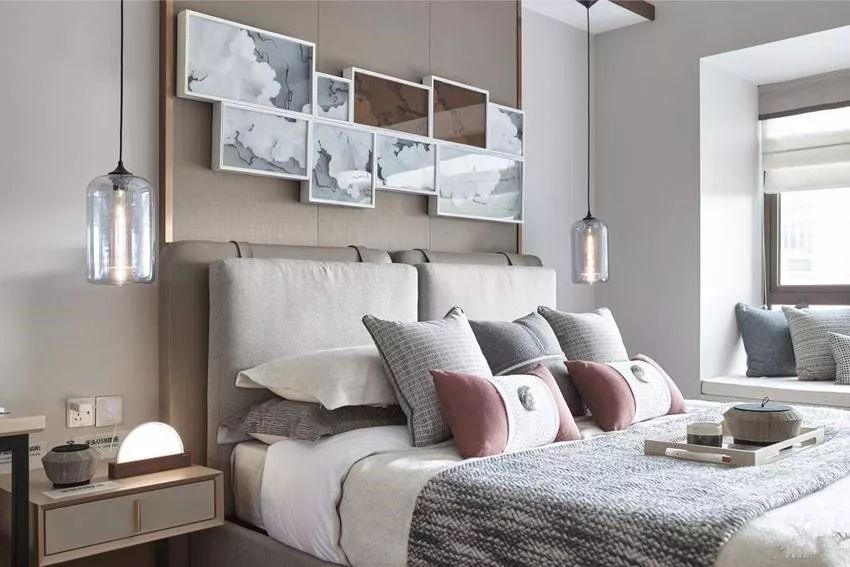 主卧选用分散的挂画又重新拼接装点床头背景墙,独特且有个性。