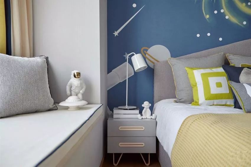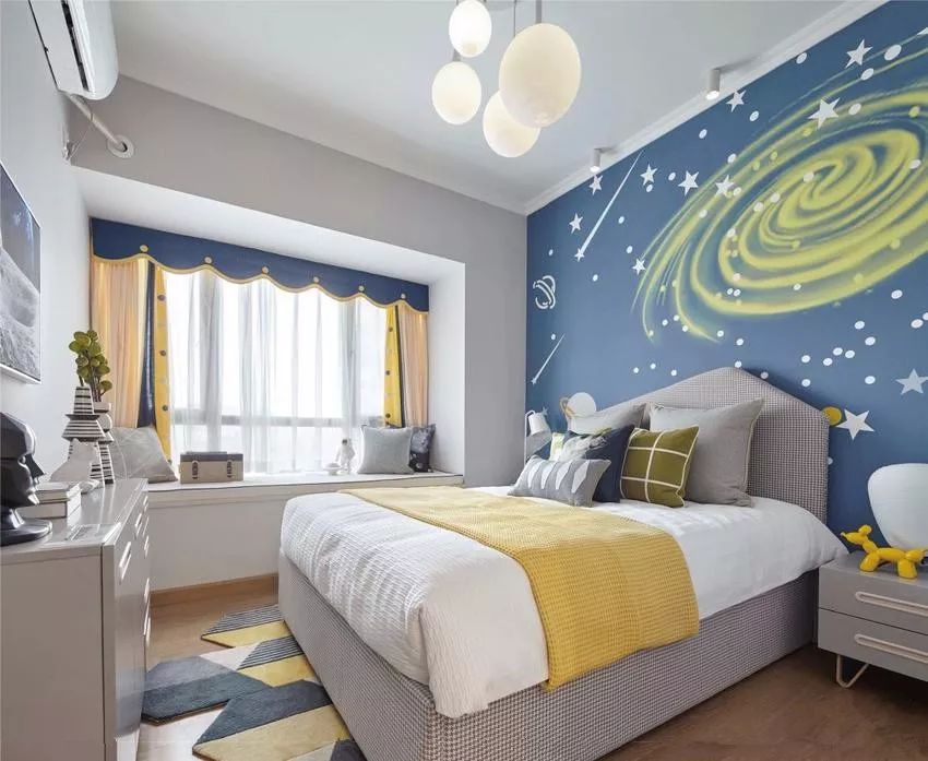 背景墙是儿童房的视觉焦点,卡通的银河系,美仑美奂,同时也能激发小孩子无限的想象力。