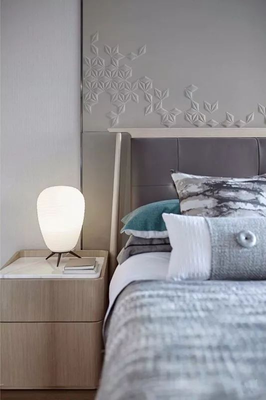 次卧的床头依循墙面打造出半高床头板,延展出收纳和展示功能,并拉宽空间横向尺度。